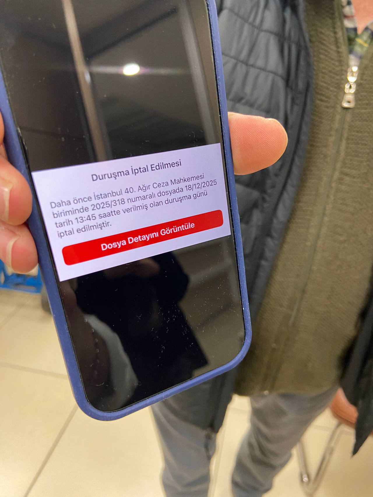 Ulusal Yargı Ağı Projesi’nden (UYAP) “Daha önce İstanbul 40. Ağır Ceza Mahkemesi biriminde 2025/318 numaralı dosyada 18/12/2025 tarih 13:45 saatte verilmiş olan duruşma günü iptal edilmiştir” bildirimi yapıldı.